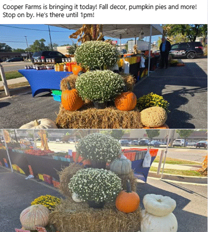 October 2, 2025 Update from the Mayor admin Posted on October 2, 2025 Posted in What's New Though the Farmers Market Is Over for the Season, Cooper Farms will be in the city hall parking lot on Friday, October 3 from 8 a.m. until 1 p.m. Mayor Mike