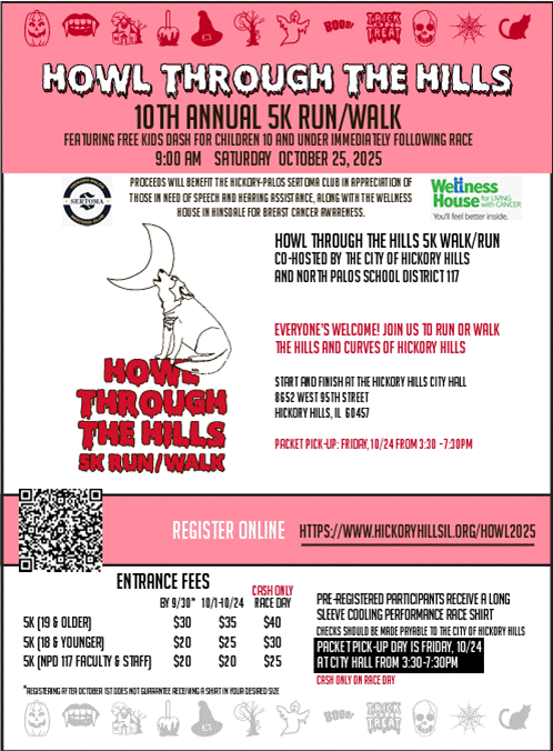 The weather for Saturday looks great and there is still time to sign up for the 10th Annual Howl Through the Hills 5K walk/run. The event will take place at 9AM on Saturday, October 25, 2025. There is still time to sign up online (see below) and you also can sign up the morning of the event. We recommend that you arrive no later than 8 a.m. if you intend to sign up the morning of the race. The race will start and finish at Hickory Hills City Hall. https://hickoryhillsil.org/howl